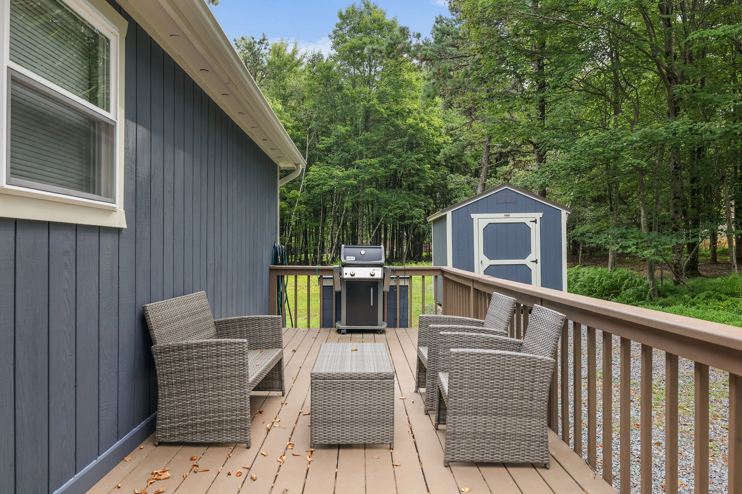 Outside, the home features a propane grill** with an outdoor seating area with plenty of seats to enjoy the nature.